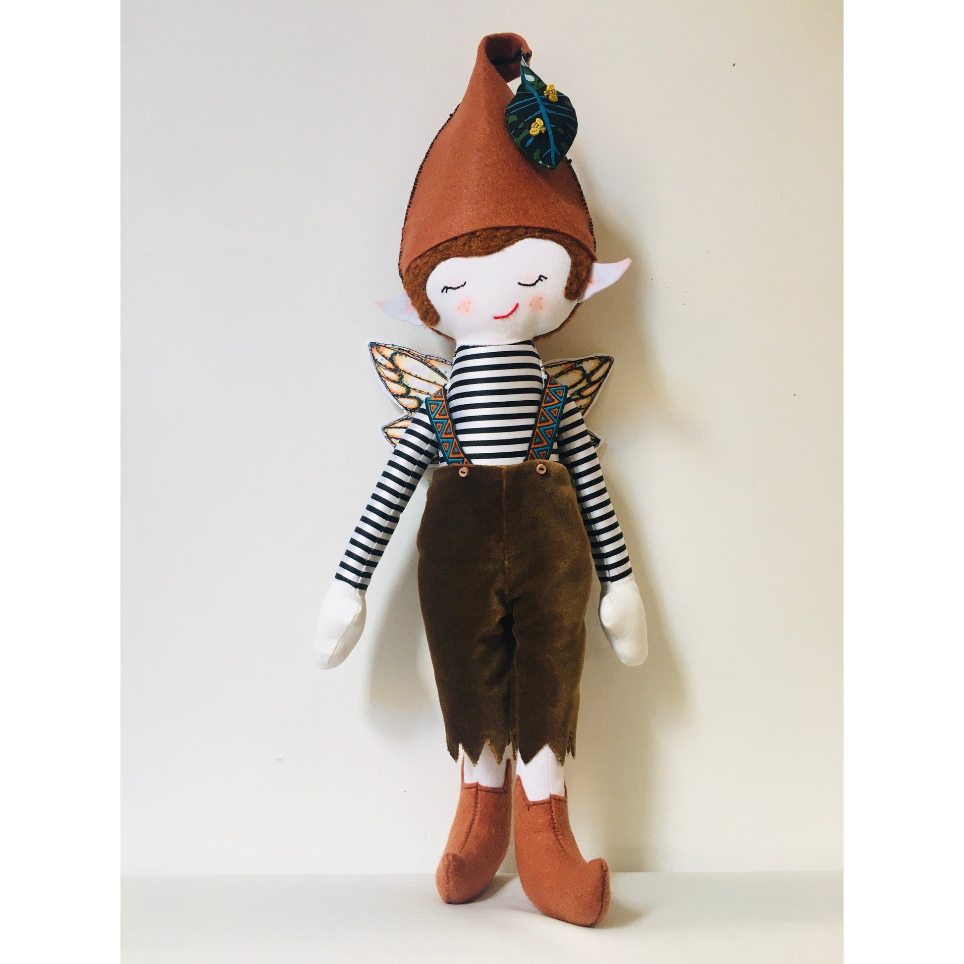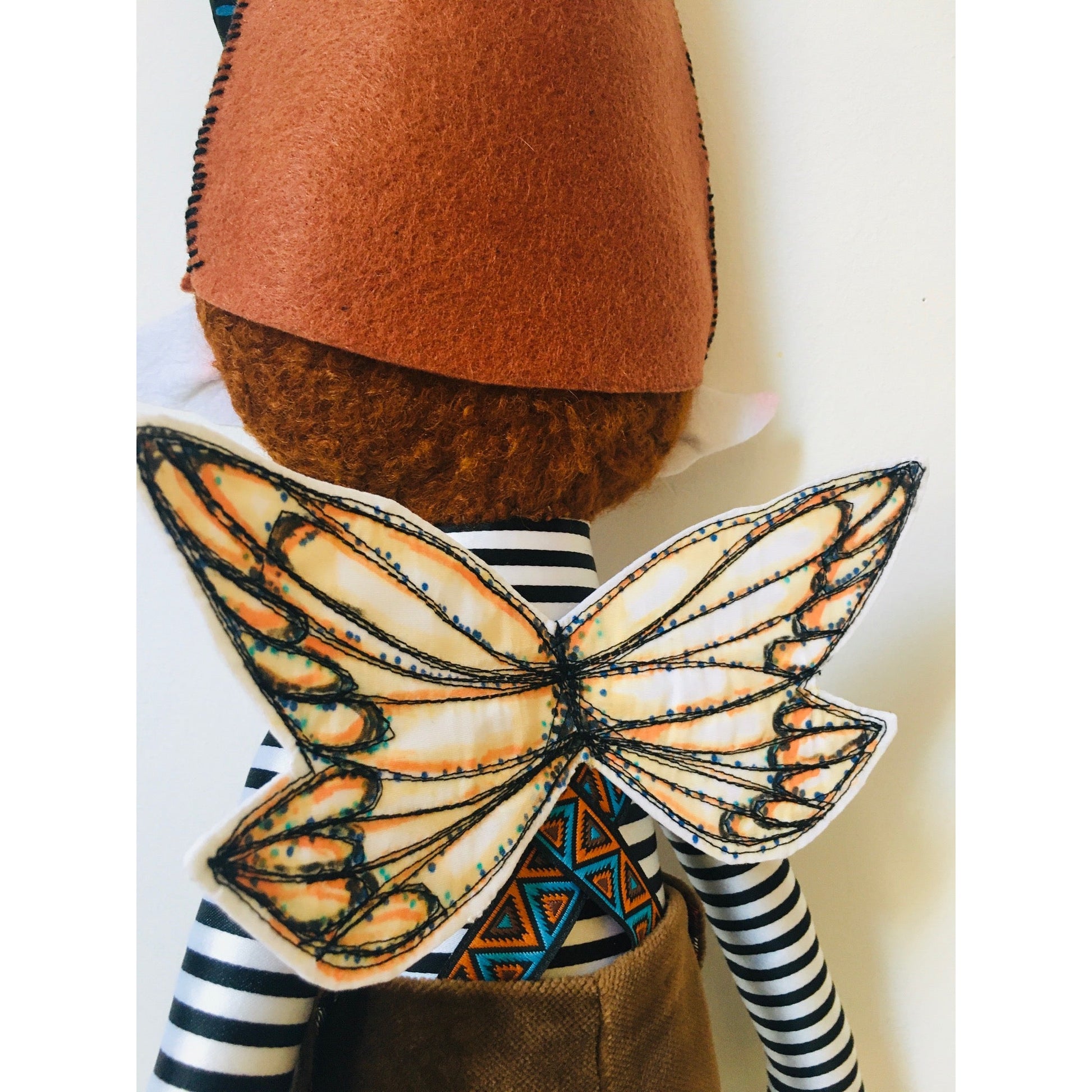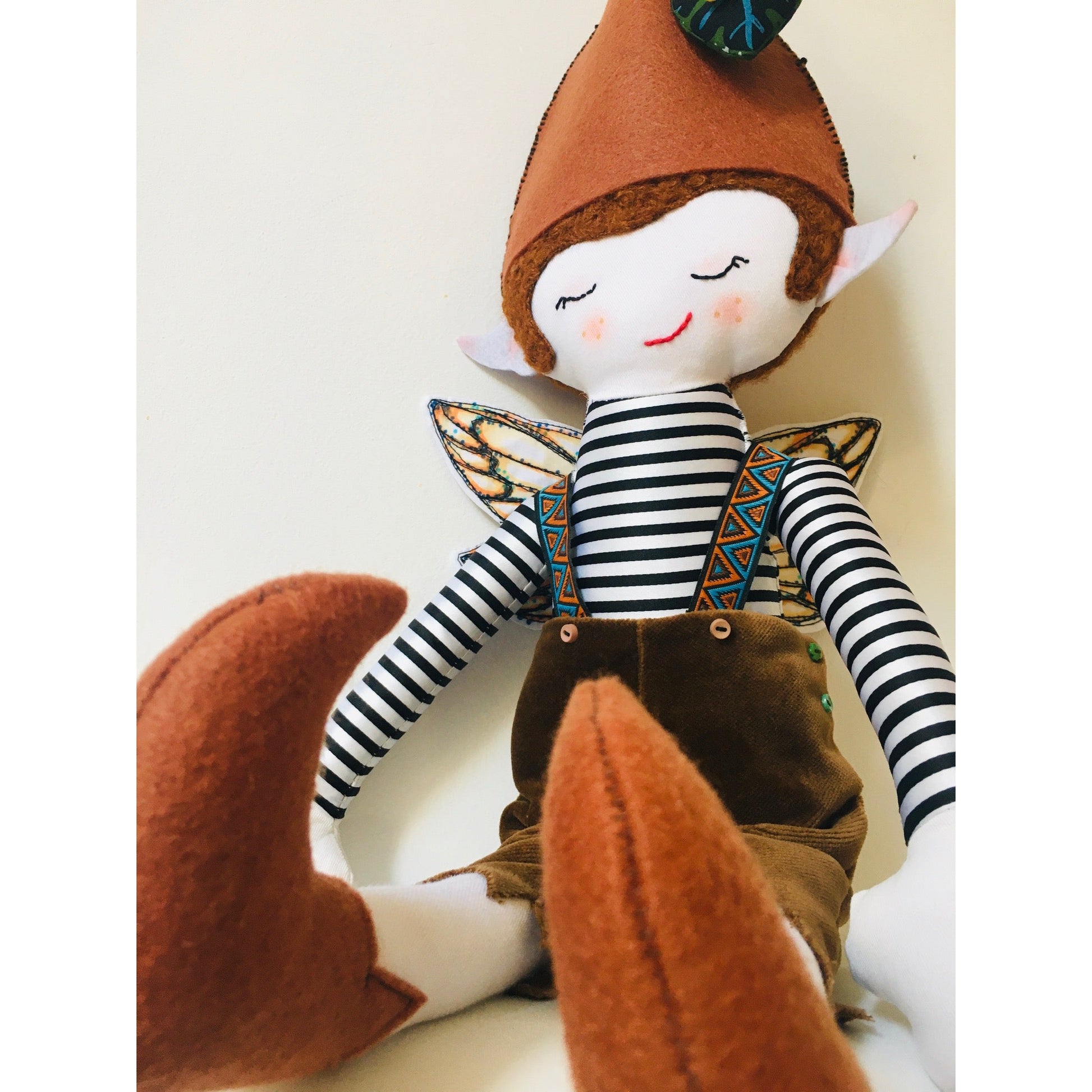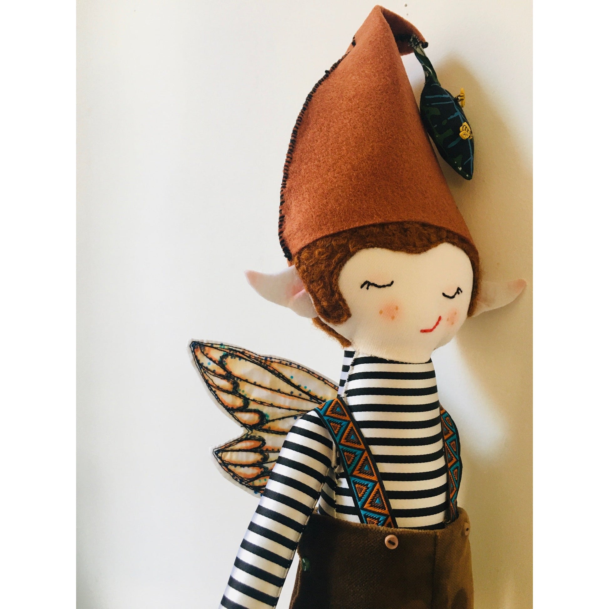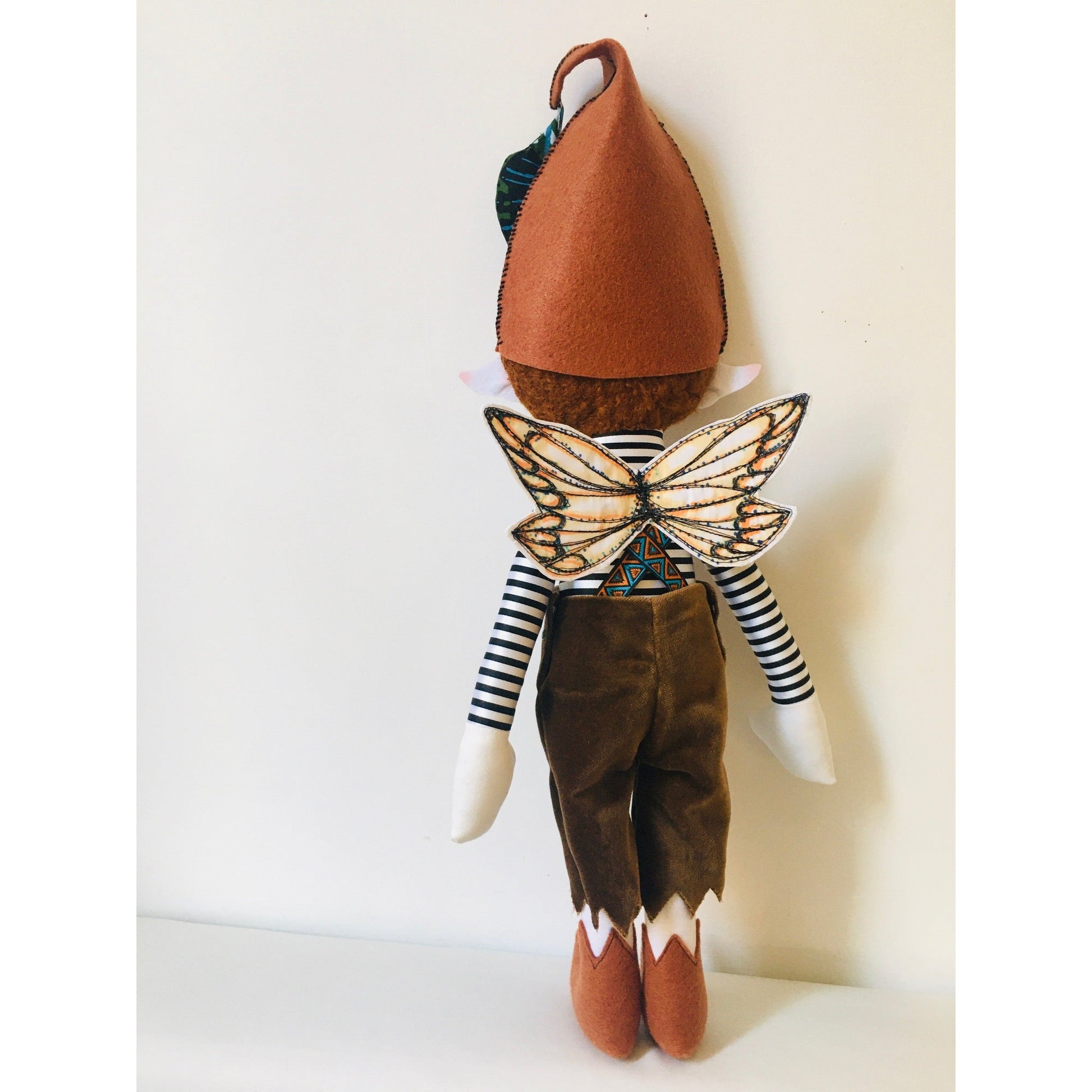 Precioso muñeco de trapo duende 100% artesanal. El Joanet es un ser diminuto que vive en los bosques catalanes y pertenece a la familia de las hadas. Sus alas de mariposa están pintadas a mano. El gorro, las alas y el pantalón se pueden quitar para así motivar al juego de vestir y desvestir.