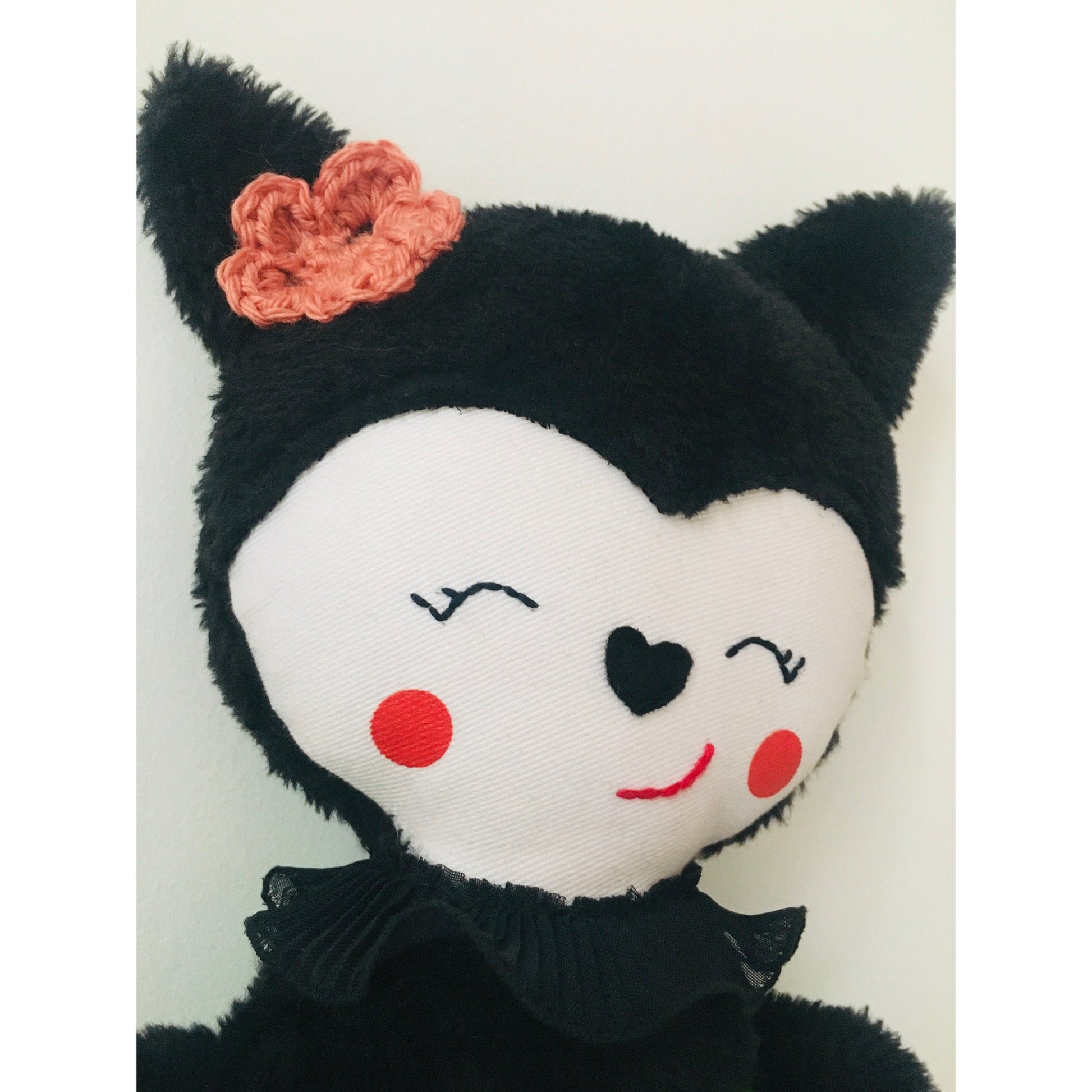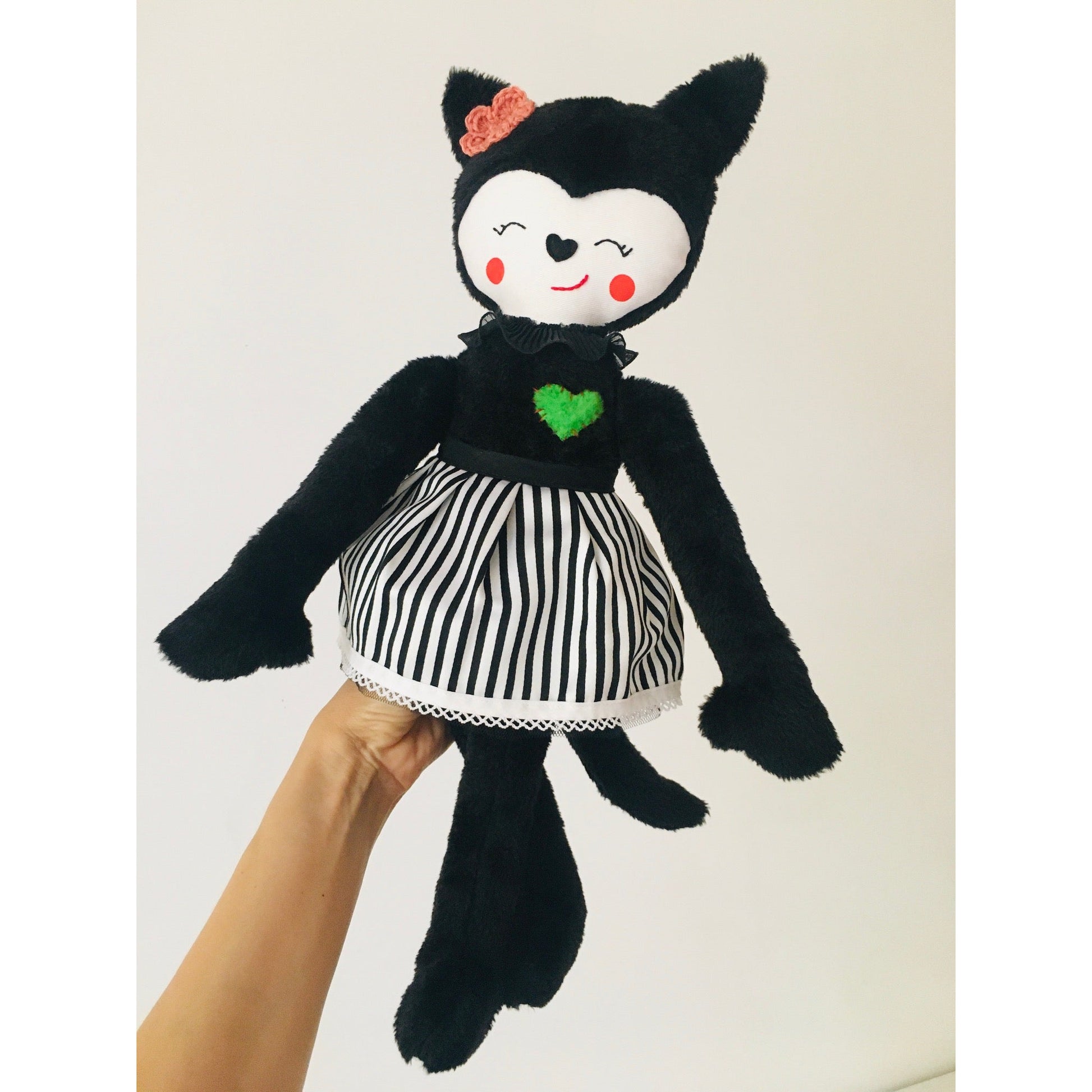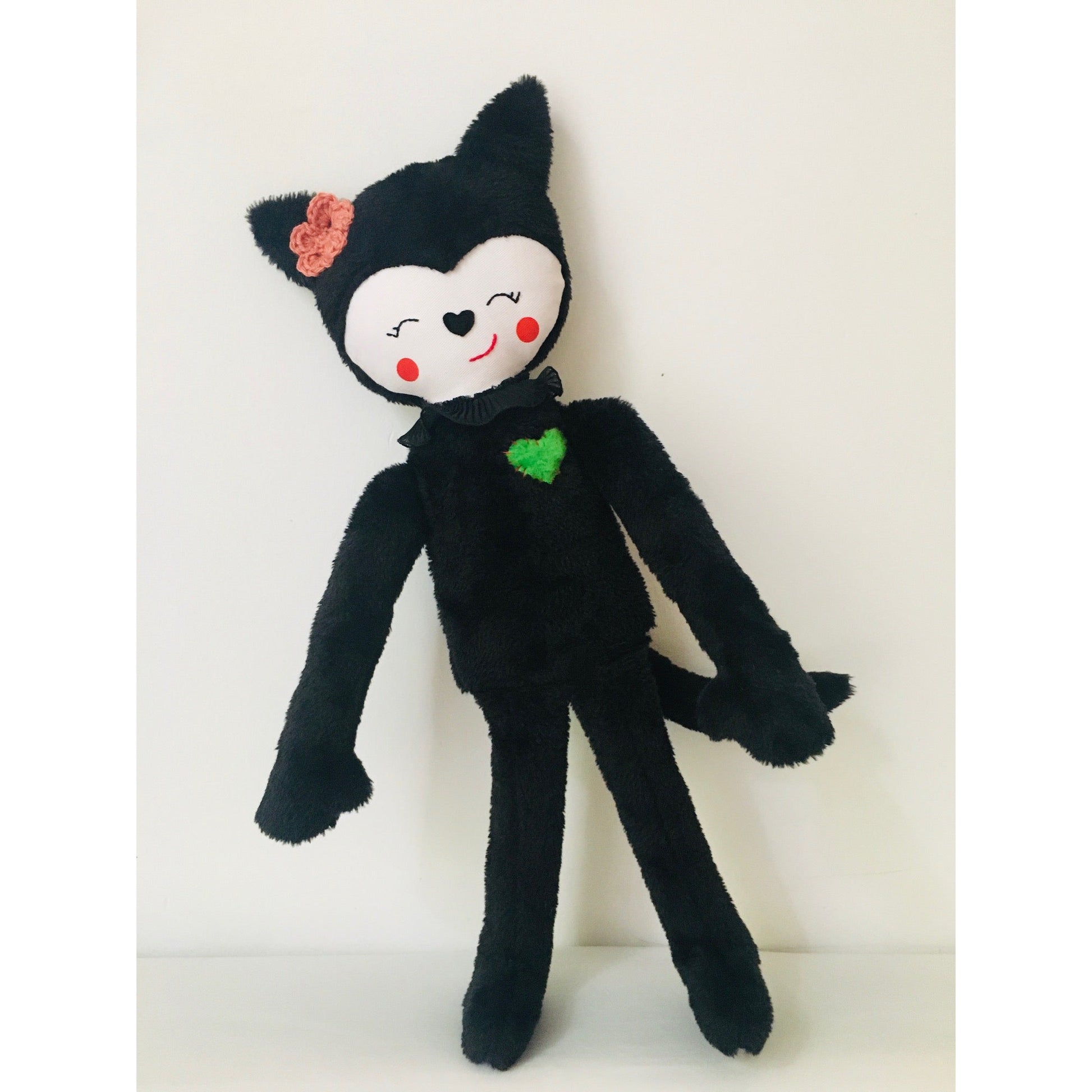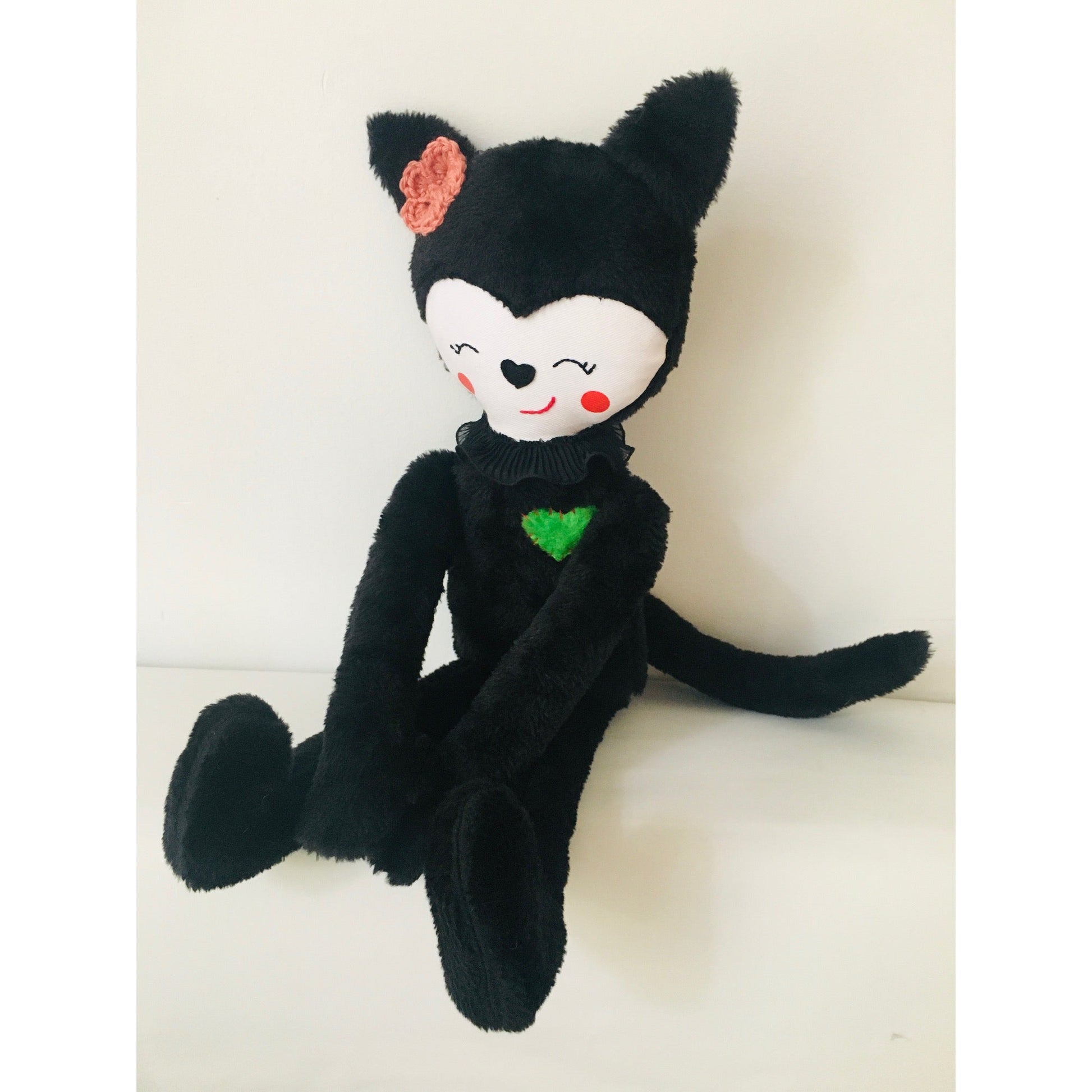 Muñeca de trapo mimosa y amorosa hecha a mano. Catnina es una gata muy juguetona y le gusta mucho dar paseos. Su corazón es verde porque le gusta comer vegetales de ese color.