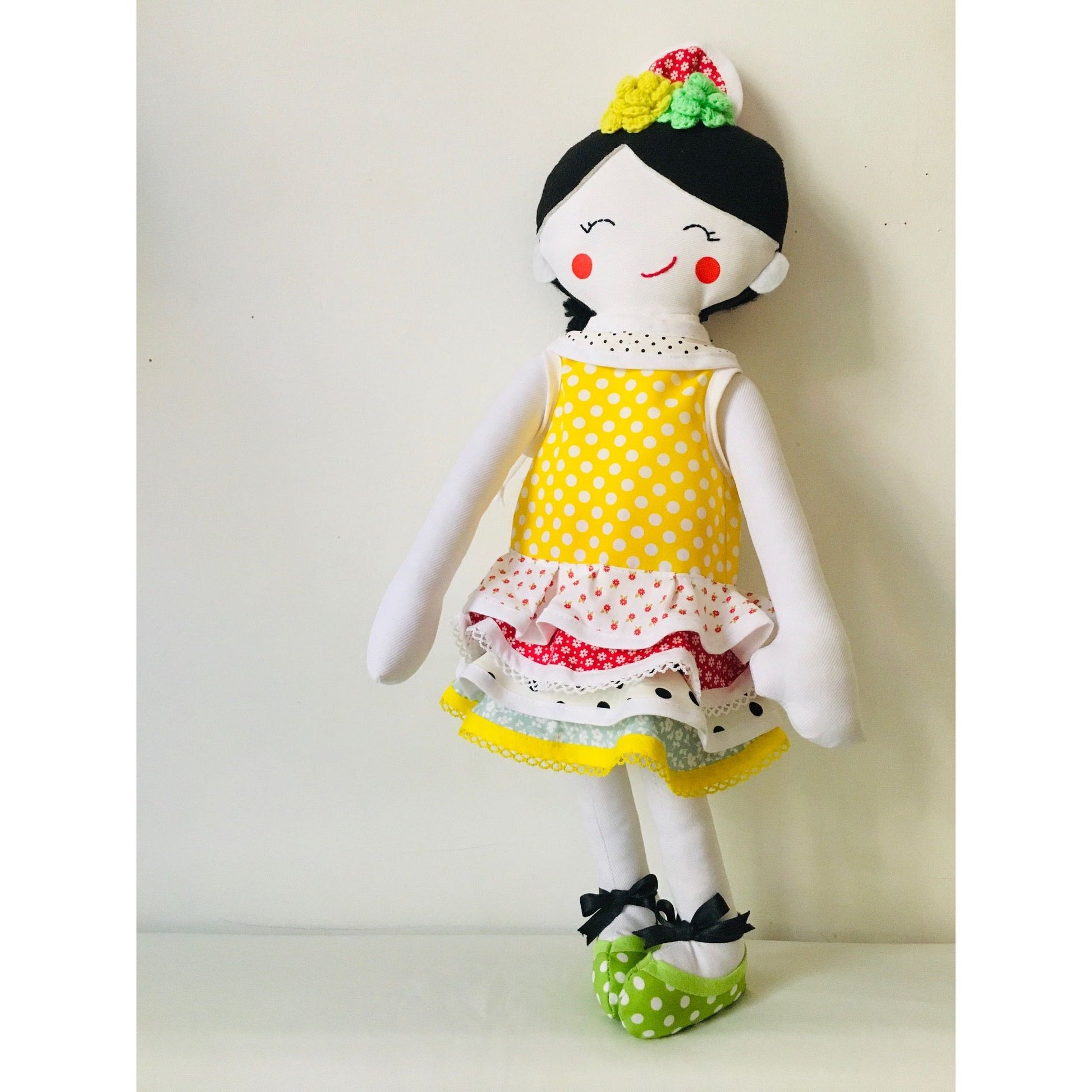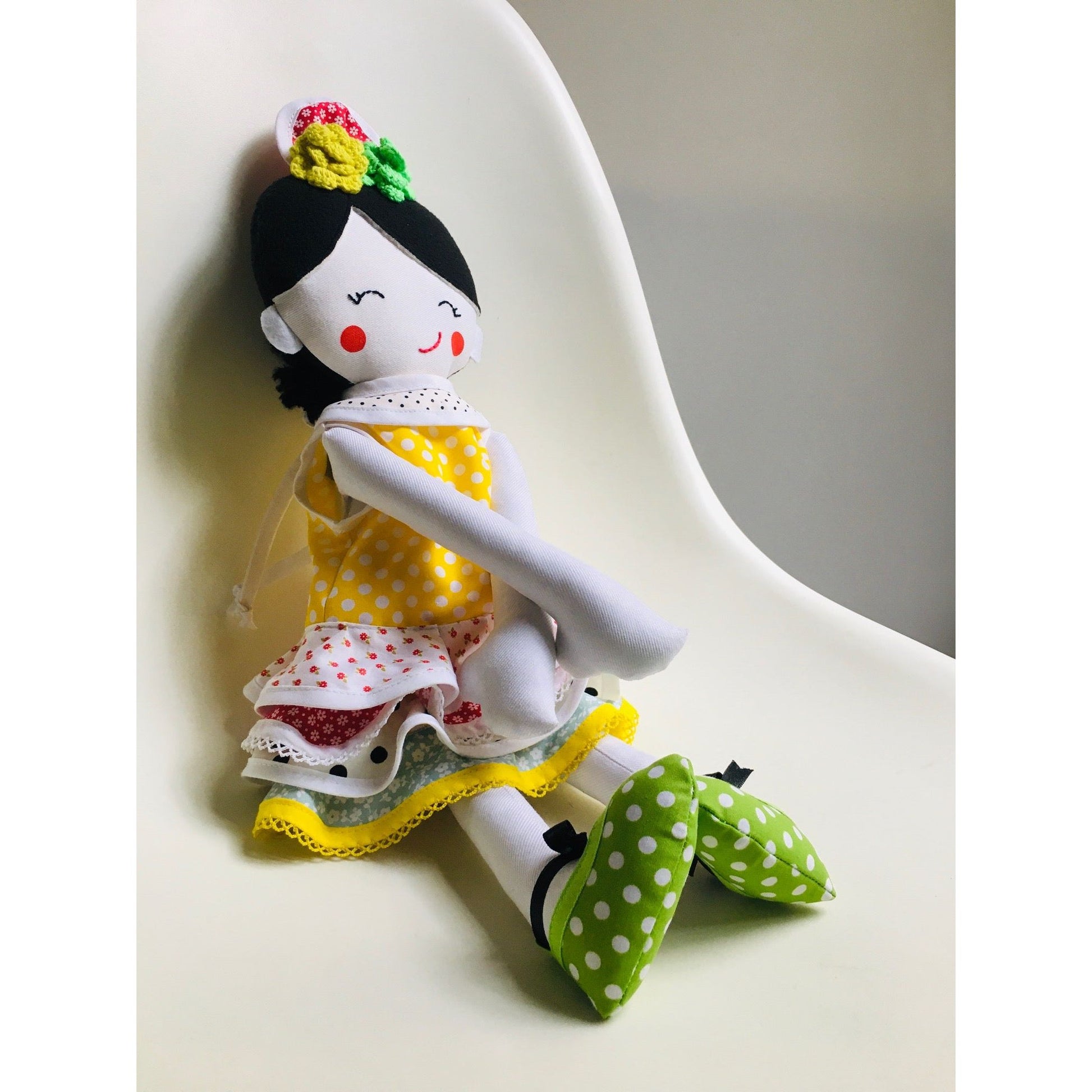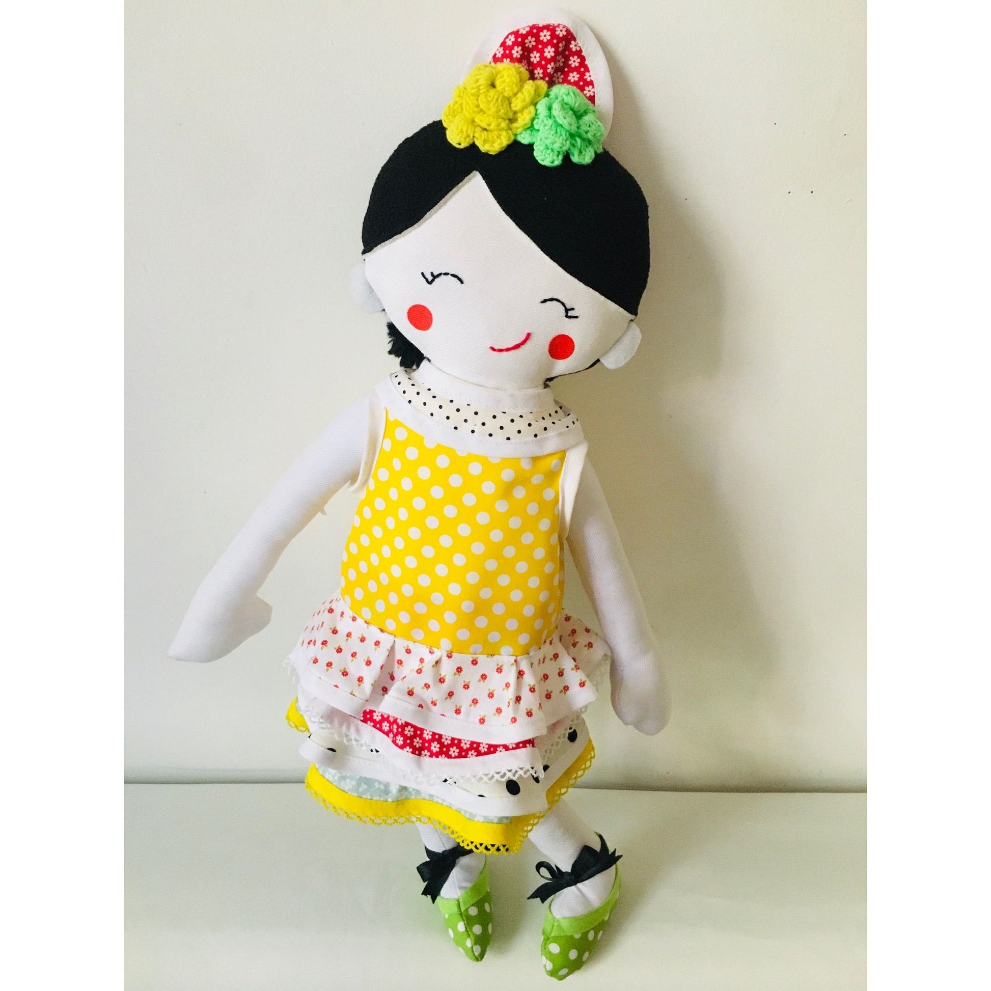 La muñeca lleva el traje típico flamenco, con flores en su cabello y sus zapatos van a juego para crear un look total.