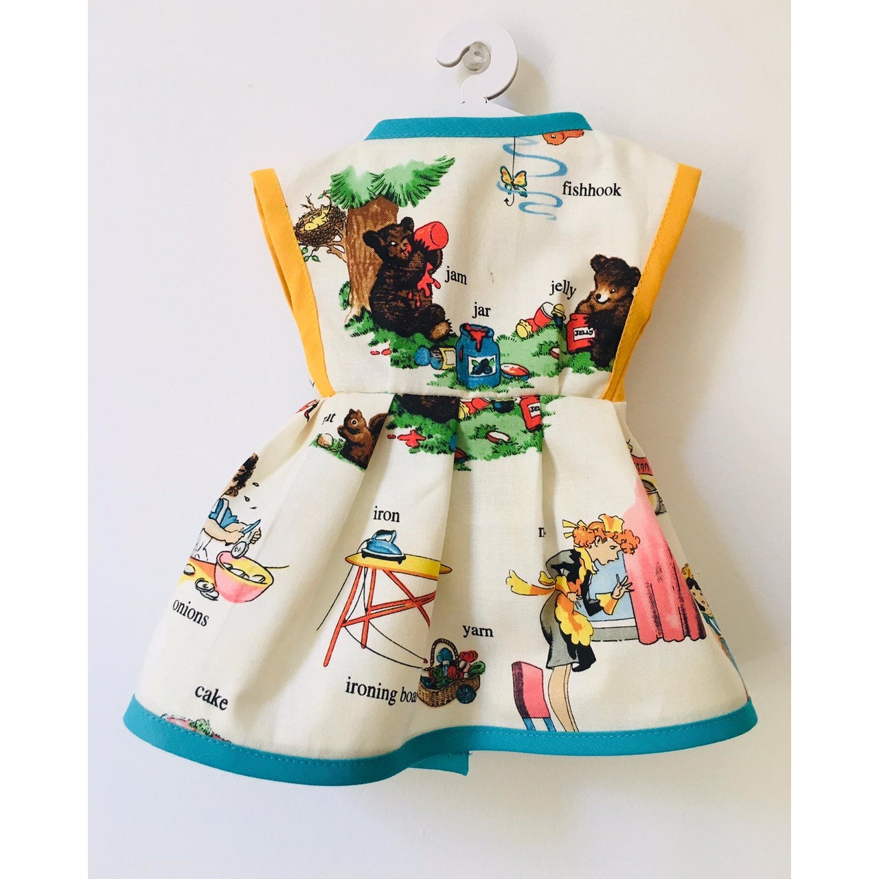 Vestido para muñecas de 100% algodón hecho a mano. Con ribetes en cuello, sisas y bajos del vestido. Lazadas traseras para cerrar. Con dibujos al estilo vintage. Muy original, tu muñeca lucirá única con este vestido.